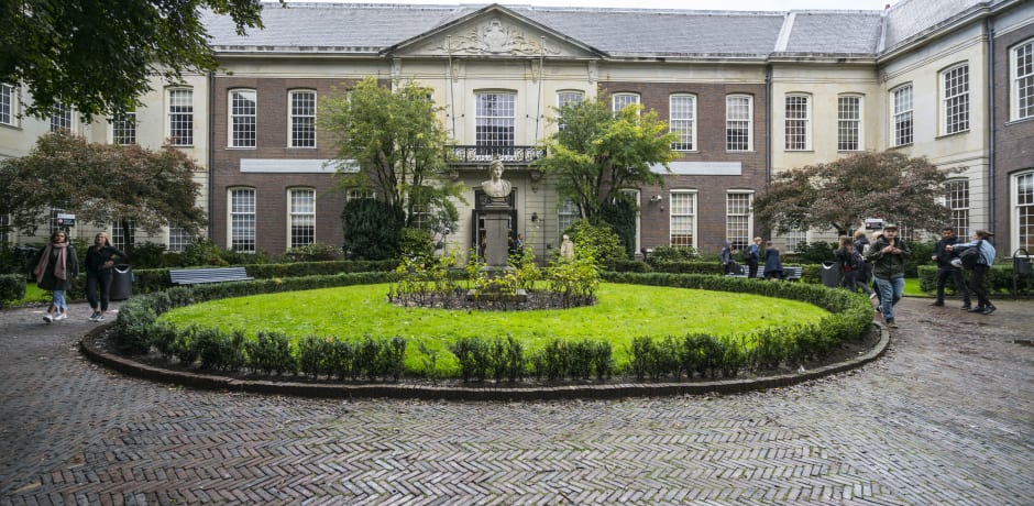De zon is inmiddels doorgebroken. In de frisse herfstlucht lopen we terug naar de binnenplaats. Du Perron kijkt met samengeknepen ogen naar het portiek boven de voordeur, met daarop het wapen van de UvA. Daarboven, op het balkon, heeft hij nog wel eens een toespraak gehouden. ‘Om hier niet meer te komen, dat voelt heel gek. Ik ben heel tevreden met het nieuwe gebouw, maar dit is toch mijn huis geweest. Daarom vind ik het heel belangrijk dat dit een gebouw van de UvA blijft. Ik werk hier wel niet meer, maar ik kan hier nog wel komen. Het binnenplaatsje blijft ook nog gewoon het binnenplaatsje, vol studenten en wetenschappers. Dat maakt de verhuizing draaglijker.’