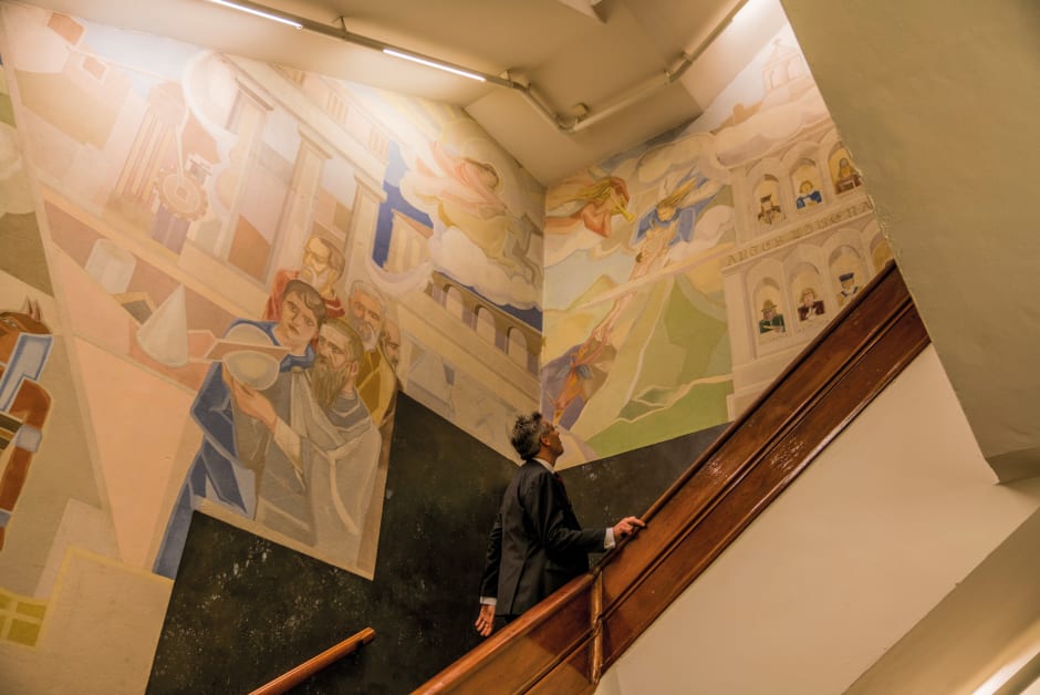 Een stuk mooier vindt Du Perron gebouw F. ‘Het heeft iets van een oude middelbare school,’ zegt hij als we de trap nemen naar het bovenste zaaltje. Het is een klim van drie etages, maar op de weg naar boven is genoeg te zien. Het gebouw, dat in 1925 vanwege een snelle toename van studenten werd bijgebouwd, is ontworpen door architect Pieter Marnette. Het ademt de stijl van de Amsterdamse School. Van beneden naar boven loopt een muurschildering, in 1951 geschilderd door Peter Alma. De schildering beeldt de geschiedenis van de wetenschap uit, te beginnen met Egyptenaren en Grieken en eindigend met een telescoop, een chromosoomschema, Einstein en Curie. ‘De juristen zeggen wel dat de Poort hun gebouw was,’ Du Perron draait zich om op de trap. ‘Dat is maar beperkt waar. Rechten heeft hier altijd gezeten, maar heel veel faculteiten hebben dit gebouw gebruikt. En dat zie je hier ook wel. De muurschildering is maar gedeeltelijk juridisch.’