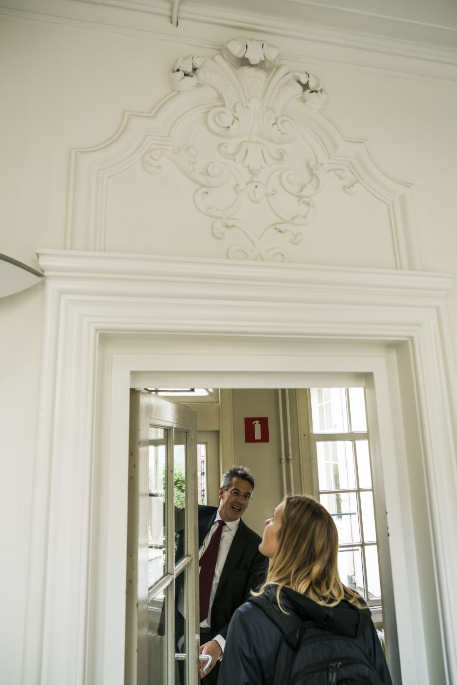 Du Perron kan als echte aansprakelijkheidsjurist precies aanwijzen waar het in de Poort, zoals hij het gebouw noemt, allemaal mis kan gaan. ‘Over deze deur gaf ik altijd college,’ zegt hij, stilstaand bij een collegezaal op de begane grond in gebouw D. ‘Er zit een kijkgat in, maar de deur zwaait naar buiten open dus als je niet oppast krijg je een deur op je neus.’ Even later stopt hij weer. ‘Vroeger moest iedereen door de centrale hal naar buiten als de colleges uit waren. We hebben een keer een ontruimingsoefening gedaan en toen duurde het twintig minuten voor iedereen buiten was. Niemand ging door de nooddeuren. Daarom moeten docenten nu voorlichting geven aan studenten over hoe je het gebouw uit moet.’