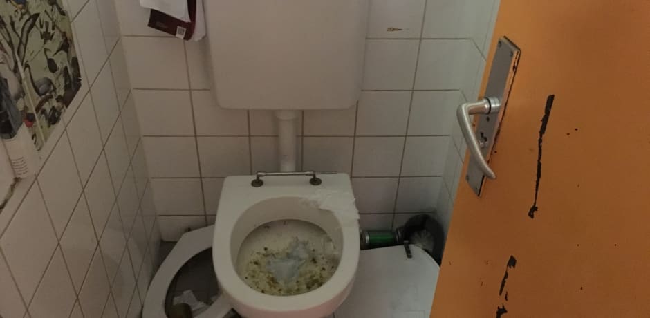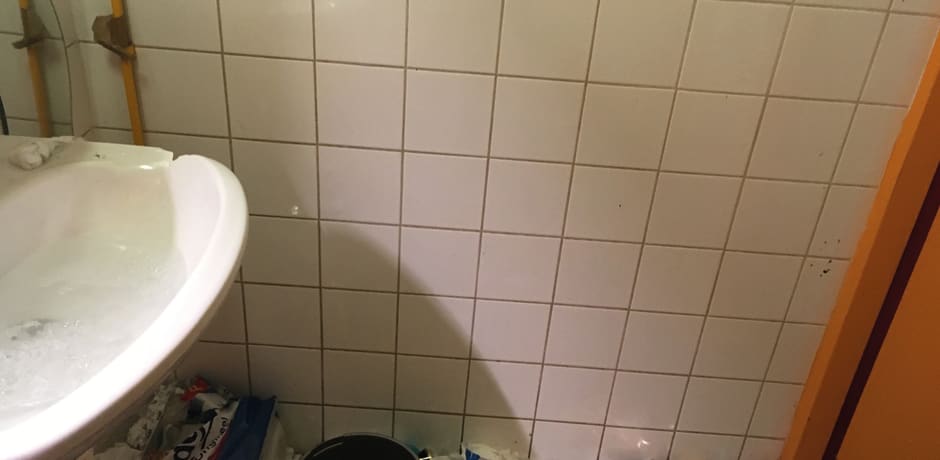 Uit de wc’s komt een sterk penetrante lucht. De toiletbril is eraf en één van de twee wc’s ligt vol kots en wc-papier. De kraan van de wastafel loopt nog. De wasbak raakt steeds voller, omdat die verstopt is door een prop papier. ‘Die wc is heavy. Die doe ik niet voor een paar tientjes. Je kan er ziek van worden: een spetter in je oog of mond krijgen. Voordat je het weet heb je Hepatitis B. Hiervoor moet ik een speciaal pak aan. Vroeger was wel alles inclusief. Nu moet je daar flink voor bijbetalen.’
