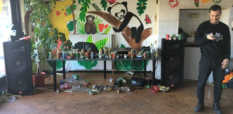 Gewapend met een emmer, een bezem en een trekker bellen Tugrul Cirakoglu (30) en Akram Aknin (18) om tien uur ’s ochtends aan bij de Weesperflat. De deur gaat met een buzzer open. Cirakoglu en Aknin banen zich een weg door de gang, waar overal lege blikjes verspreid liggen. Ook staat er een meisje te bellen, klaarblijkelijk met de woningbouwvereniging. Ze kan haar kamer niet in omdat ze haar sleutels kwijt is. In de woonkeuken staat het aanrecht vol lege bierblikken en -flessen. De vloer plakt en ligt vol met afval. De zure geur van verschaald bier is duidelijk te ruiken. Aan de zijkant staan gigantische speakers en discolampen en achter de tafel prijkt een muurschildering met panda en een aap in de jungle. ‘Dit ziet eruit als een milde klus,’ zegt Cirakoglu, eigenaar van schoonmaakbedrijf Frisse Kater.