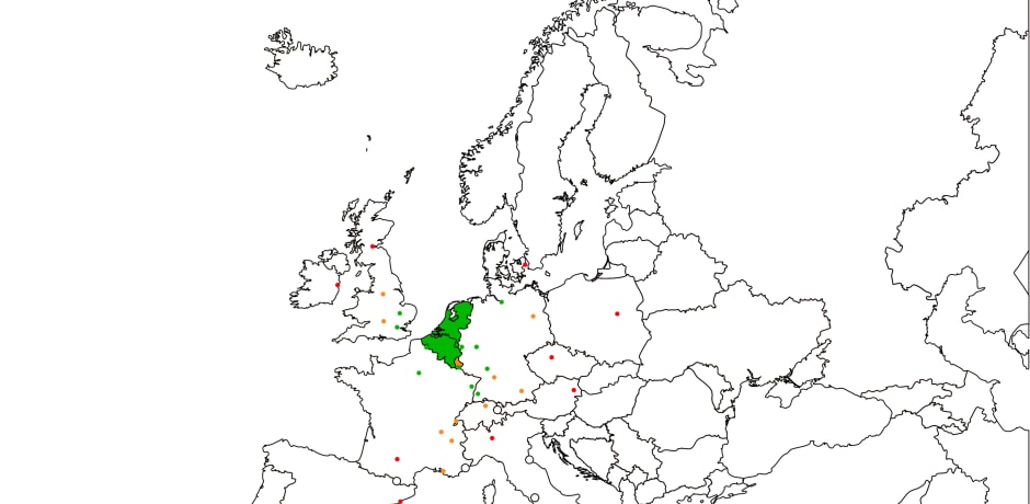 (Bekijk op deze afbeelding (hier in het groot) welke steden op een groene of oranje lijst zouden staan. Lees verder onder de afbeelding)