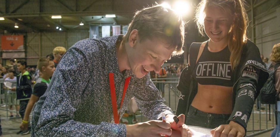 Vooraan in de rij staat Sascha Nieuwkoop (18). Zodra de wachtrij opent stapt hij op Rick af. ‘Eindelijk kan ik je ontmoeten,’ barst hij uit. ‘Wil je je handtekening zetten? En wil je me toevoegen op Nintendo Switch? Dit is mijn code.’ Rick ontvangt hem open, stelt veel vragen, en gaat met hem op de foto.