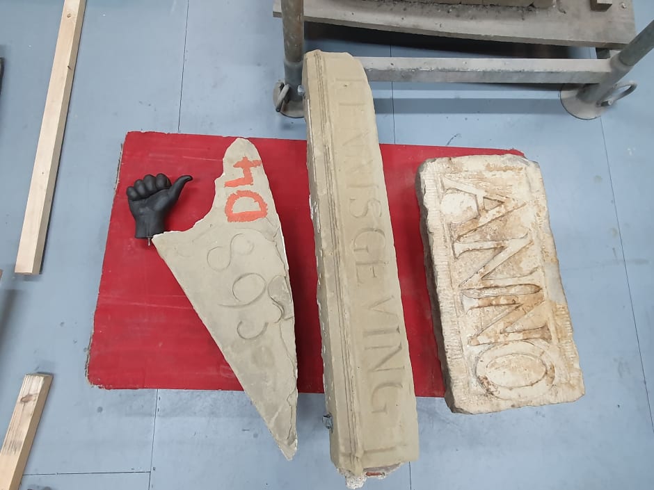Uitgestald over de kamer staan marmeren stenen waar Latijnse of oudnederlandse woorden in gebeiteld zijn. Het zijn fragmenten van Amsterdamse monumenten, legt Pittas uit. Zelf beschouwt hij het liever als archaeological junk. ‘Het heeft niet veel betekenis meer, maar wel genoeg emotionele en praktische waarde om niet door de gemeente bij het grof vuil gezet te worden,’ zegt Pittas. De gemeente Amsterdam koos er voor om deze fragmenten van oude façades niet weg te gooien, maar door particulieren te laten hergebruiken.