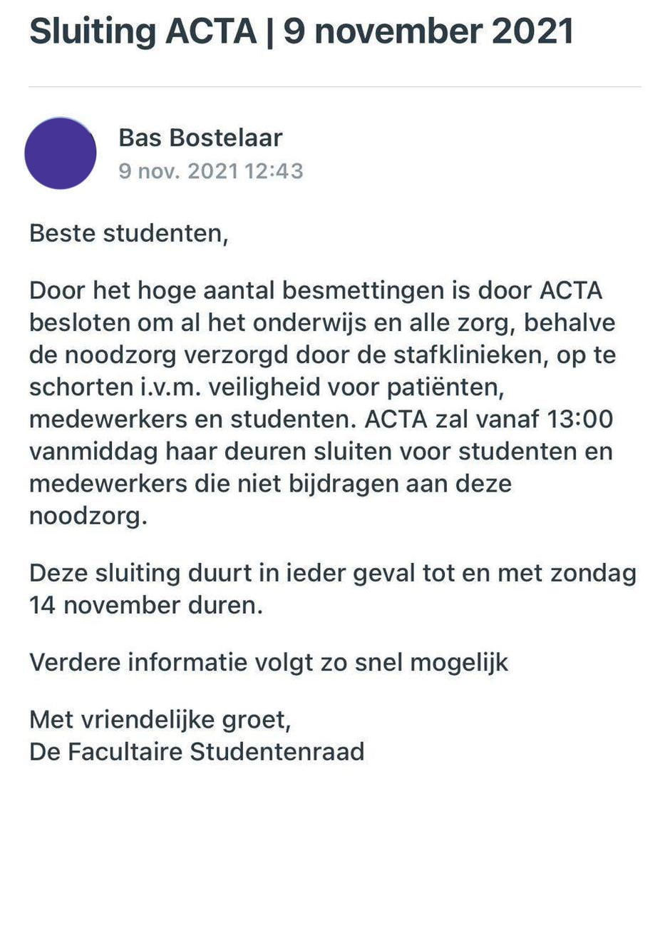 Het aantal coronabesmettingen op tandheelkundefaculteit Acta is zo hoog dat het bestuur van de faculteit de hele faculteit de rest van de week sluit. Alle reguliere zorg wordt afgezegd en fysiek onderwijs wordt gecanceld. Het zou gaan om een sluiting die duurt tot en met 14 november.