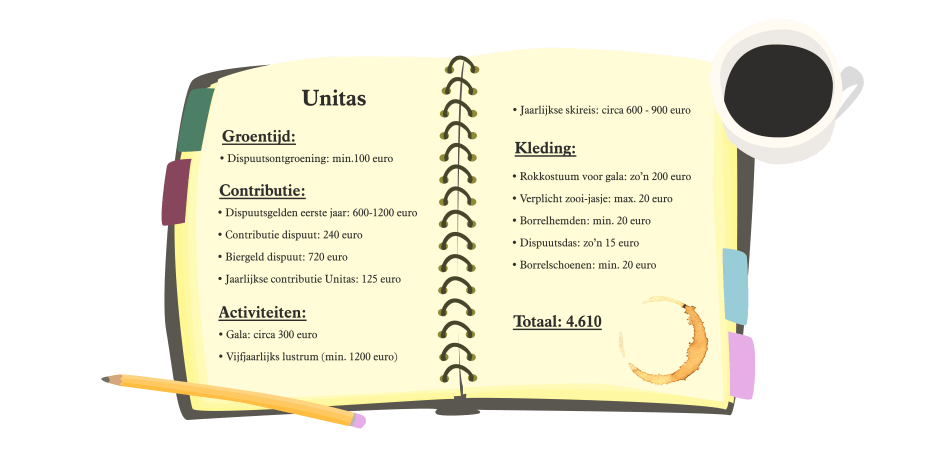 Another fixed expense is the membership fee. You pay this to both your association and your fraternity. To start with the latter: at A.S.C/A.V.S.V. this is often included in the fraternity fee, at Unitas and Ascrum, on the other hand, you pay it separately, for 240 and 200 euros a year respectively. Finally, to your association, you pay 75 euros a year at the corps and 125 euros at Unitas.