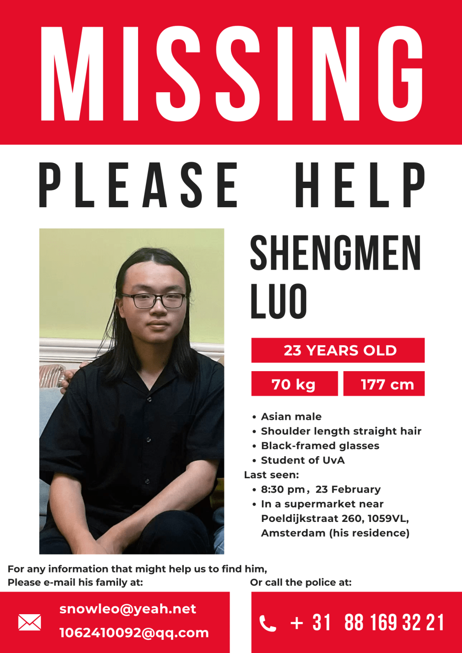 Luo’s uncle Jian Fan has been in Amsterdam over the past few days to help the police and fellow students with the search for Luo, a master’s student of Logic at the Faculty of Science. So far, no one has any idea where he might have gone. According to a flyer, he was last seen on the evening of Sunday 23 February in a supermarket near Poeldijkstraat, a complex for international students run by the De Key housing association. The Integral Security department of the UvA formally reported the disappearance to the police on 1 March.