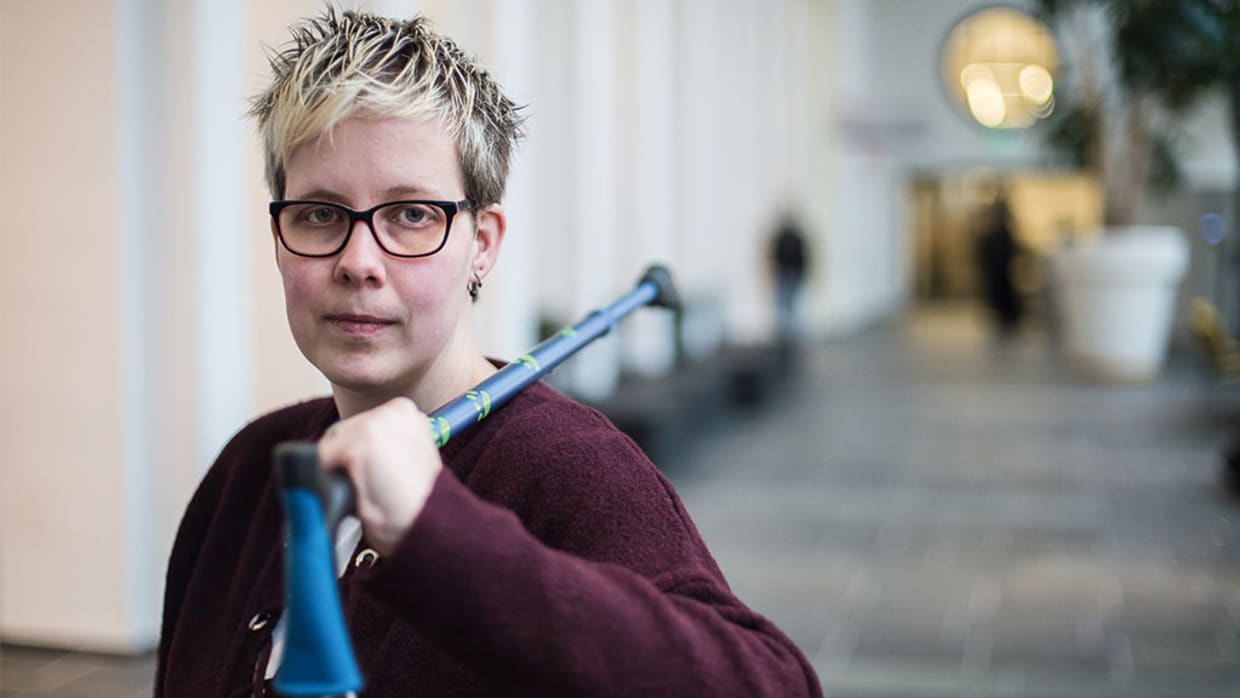 In Folia 20 volgden we de 30-jarige Jacintha Brehler, student sociaal pedagogische hulpverlening (SPH) aan de HvA. Jacintha is aan haar rechteroog blind en ziet met haar linkeroog maar 15 procent. Ook heeft ze de ziekte multiple sclerose (MS), waardoor ze met een wandelstok loopt. Hoewel de docenten in principe rekening met haar houden – ze printen bijvoorbeeld opdrachten extra groot uit – loopt Jacintha steeds vaker letterlijk en figuurlijk tegen problemen aan. Zo bleef ze onlangs, toen ze een rollator mee naar school nam, constant haken achter de groefjes op de vloer van het Kohnstammhuis.