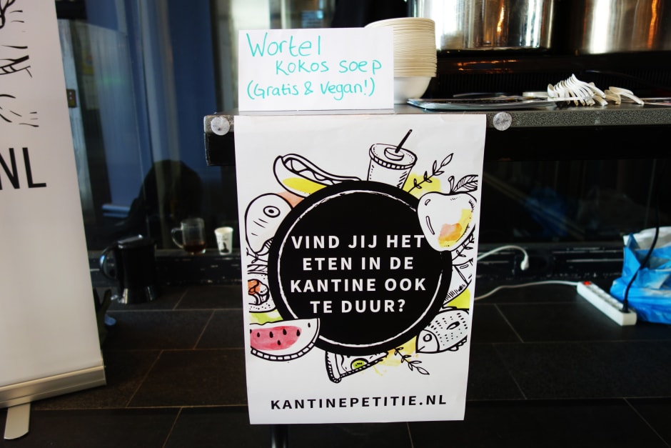 Facultaire partij Stout protesteerde vandaag op Science Park tegen de hoge prijzen in de universiteitskantines. Ze deelden gratis wortelsoep uit aan studenten op het Science Park en zochten steun voor hun petitie tegen de gestegen kantineprijzen. ‘Deze wortelsoep met kokos kost dertig cent per kom. In de kantine is het één euro vijftig,’ aldus Willemijn Bulterman van Stout.