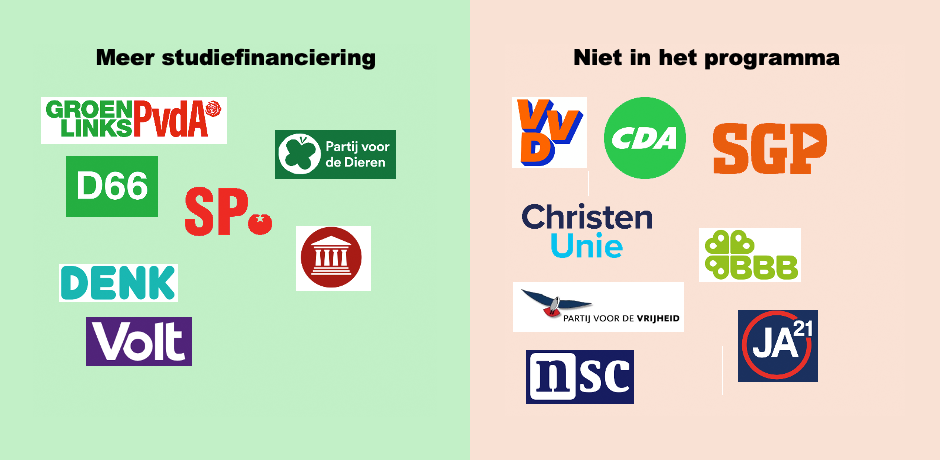 Het CDA wil een beurzenprogramma voor excellente studenten. Die partij zou je dus ook in de linker tabel kunnen zetten. NSC zegt de basisbeurs in elk geval te willen behouden.