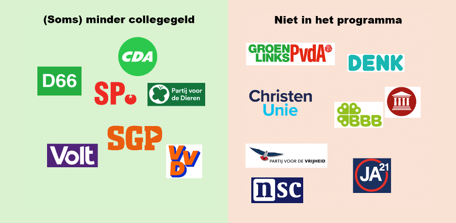 De SP wil op termijn helemaal geen collegegeld meer heffen. De VVD trekt de aandacht met een ‘kortstudeerbonus’ voor studenten die op tijd afstuderen. Dat zou dus het omgekeerde zijn van een langstudeerboete (waar BBB voor pleit). Zo’n boete krijgen de onderwijsinstellingen van de VVD wél: zij moeten een vertragingsbijdrage betalen als studenten uitlopen.