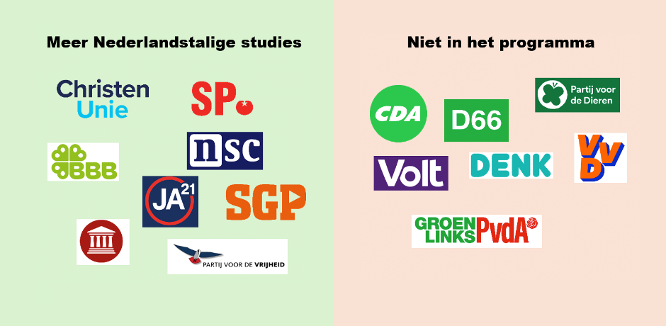 Er komen te veel studenten uit andere landen hierheen, vinden sommige partijen. Om dat te veranderen, zouden meer opleidingen in het Nederlands moeten lesgeven. Dat is trouwens ook beter voor de beheersing van het Nederlands, voegen ze eraan toe. Uiteenlopende partijen als SP, SGP en PVV kunnen zich daarin vinden.