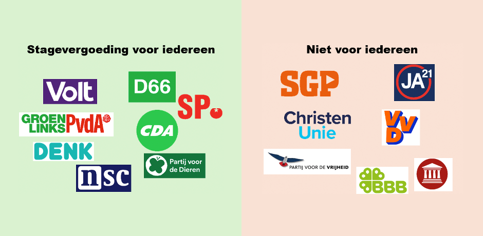 Andere partijen vrezen dat met name kleine bedrijven door zo’n verplichting minder stageplaatsen gaan aanbieden. Dan raken we van de regen in de drup, menen ze. ChristenUnie en SGP willen wel een vergoeding, maar zeggen dat alleen over mbo-studenten.