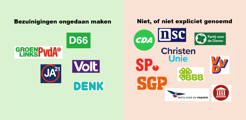 Andere partijen zeggen het niet expliciet. SP bijvoorbeeld wil het onderwijs gratis maken en fors investeren in fundamenteel en onafhankelijk onderzoek, maar de partij zegt niet letterlijk: we maken de bezuinigingen ongedaan. Zoiets geldt ook voor Partij voor de Dieren.