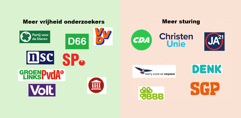 Soms is het lastig te zeggen of de partijen nu meer vrijheid willen of niet. De SGP onderstreept bijvoorbeeld dat onderzoek naar de Holocaust ongehinderd voortgang moet kunnen hebben, maar blijft tegen embryokweek voor wetenschappelijke doeleinden. Ook willen de gereformeerden graag meer praktijkgericht onderzoek. Al met al klinkt het toch als ‘meer sturing’ dan als ‘meer vrijheid’.